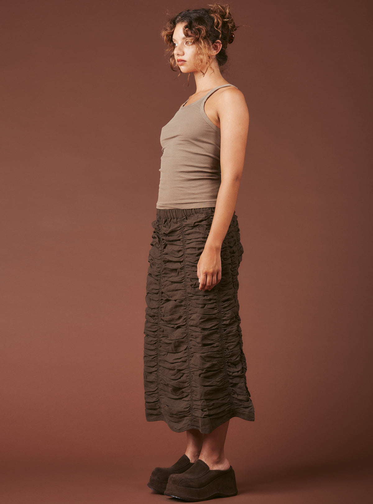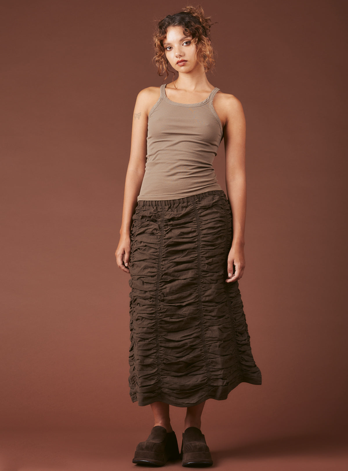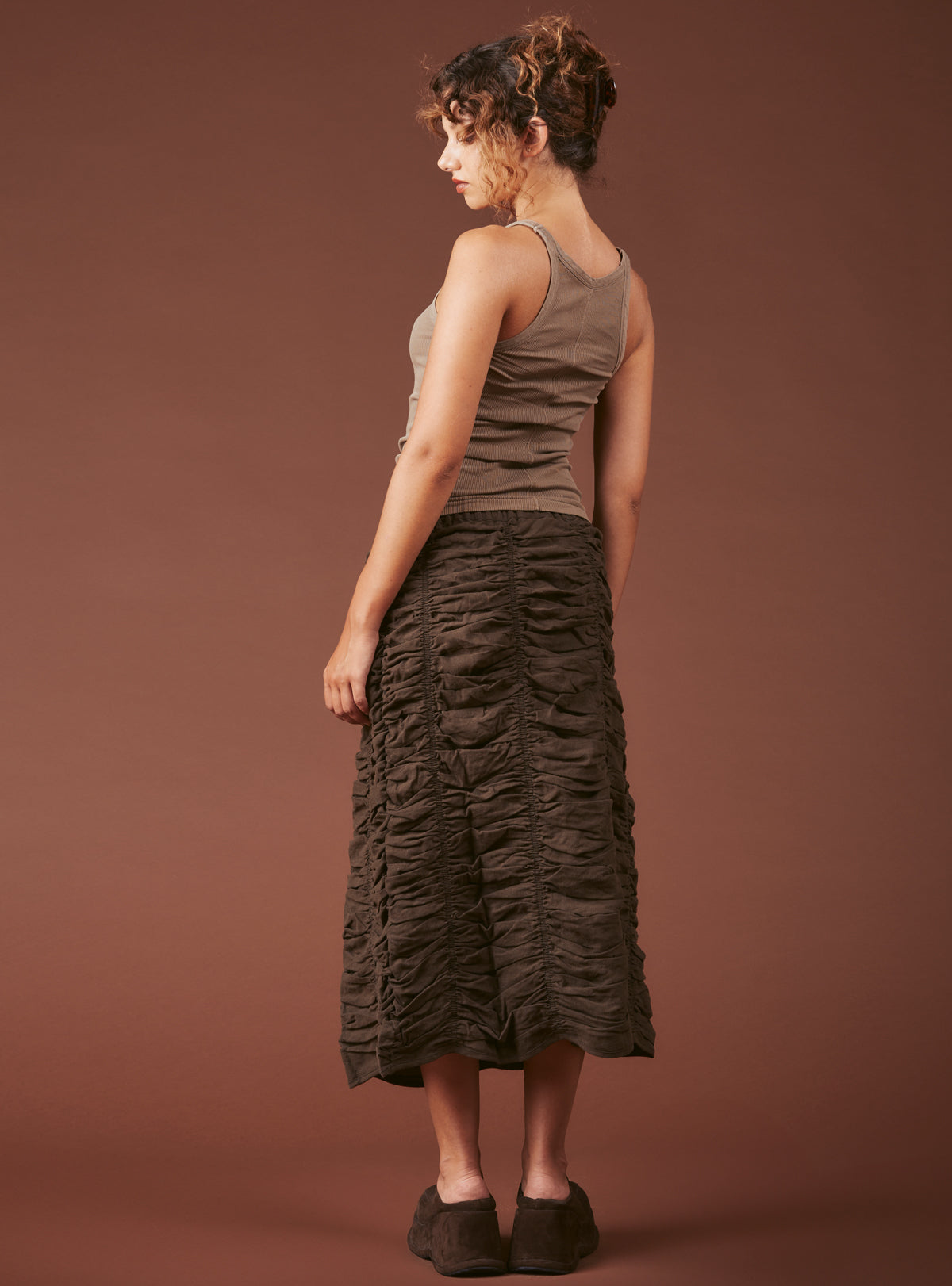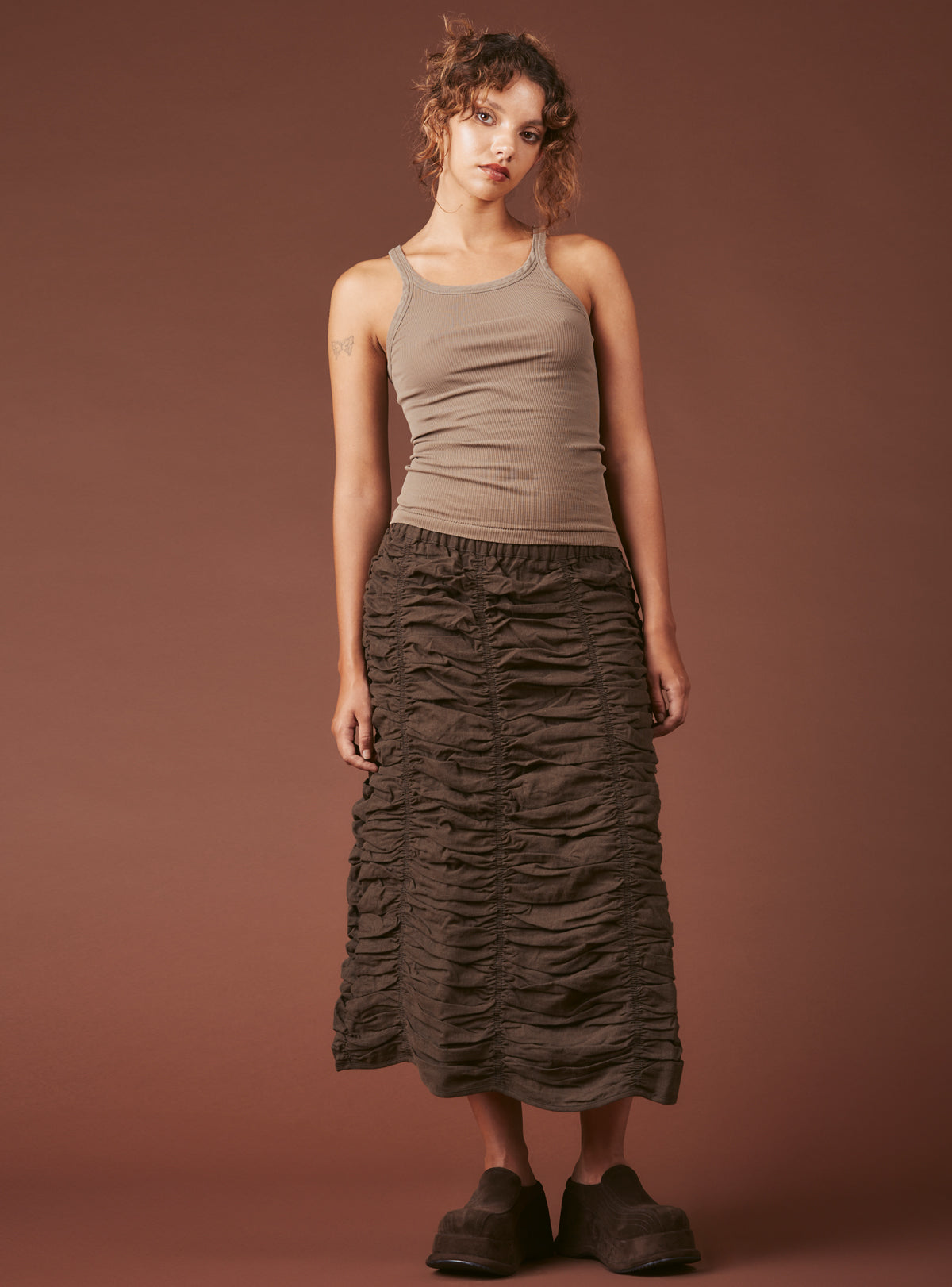 The Bounce Skirt is a gorgeous midi-length skirt with panelled, ruching details throughout and an elastic waist.