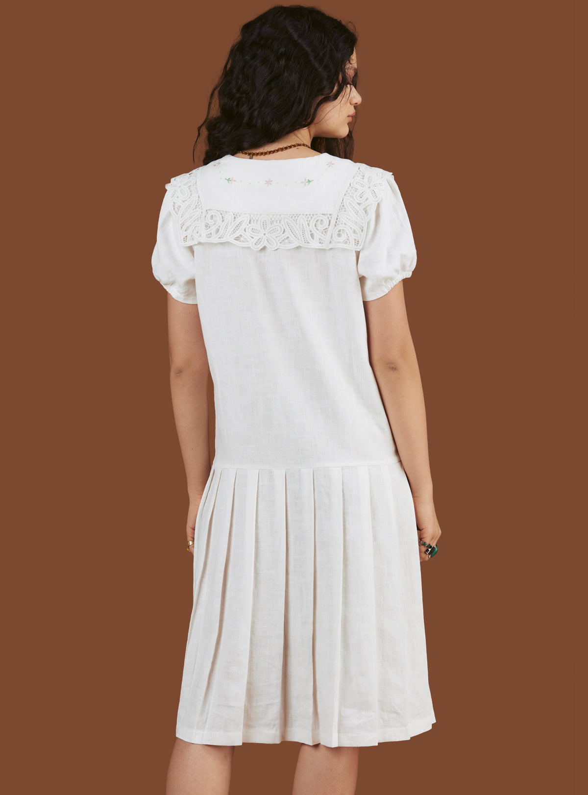 The Konoha Dress is a mid-length, drop-waist dress with a tonal button front, lace detailing at the collar along with hand-embroidered flowers. Fit is true to size.